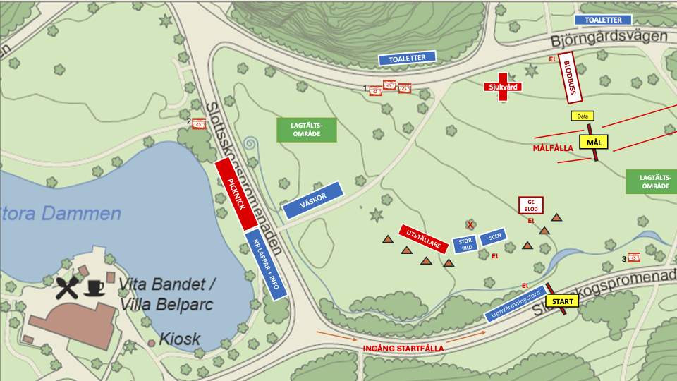 Toaletter finns placerade inom start och målområdet. Tänk på att restaurangerna i Slottsskogen är separata enheter och att deras toaletter och bord och stolar inte får nyttjas om man inte är kund.